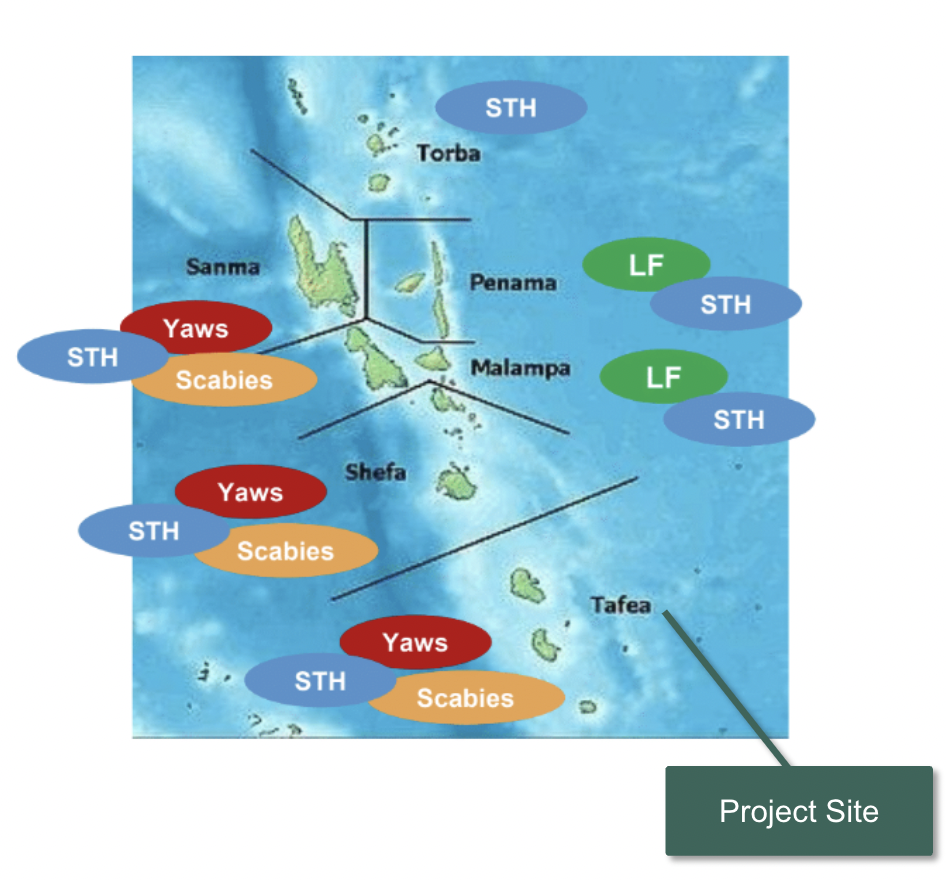 Image above: Map of Vanuatu and where specific NTDs are prevalent.